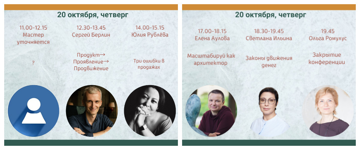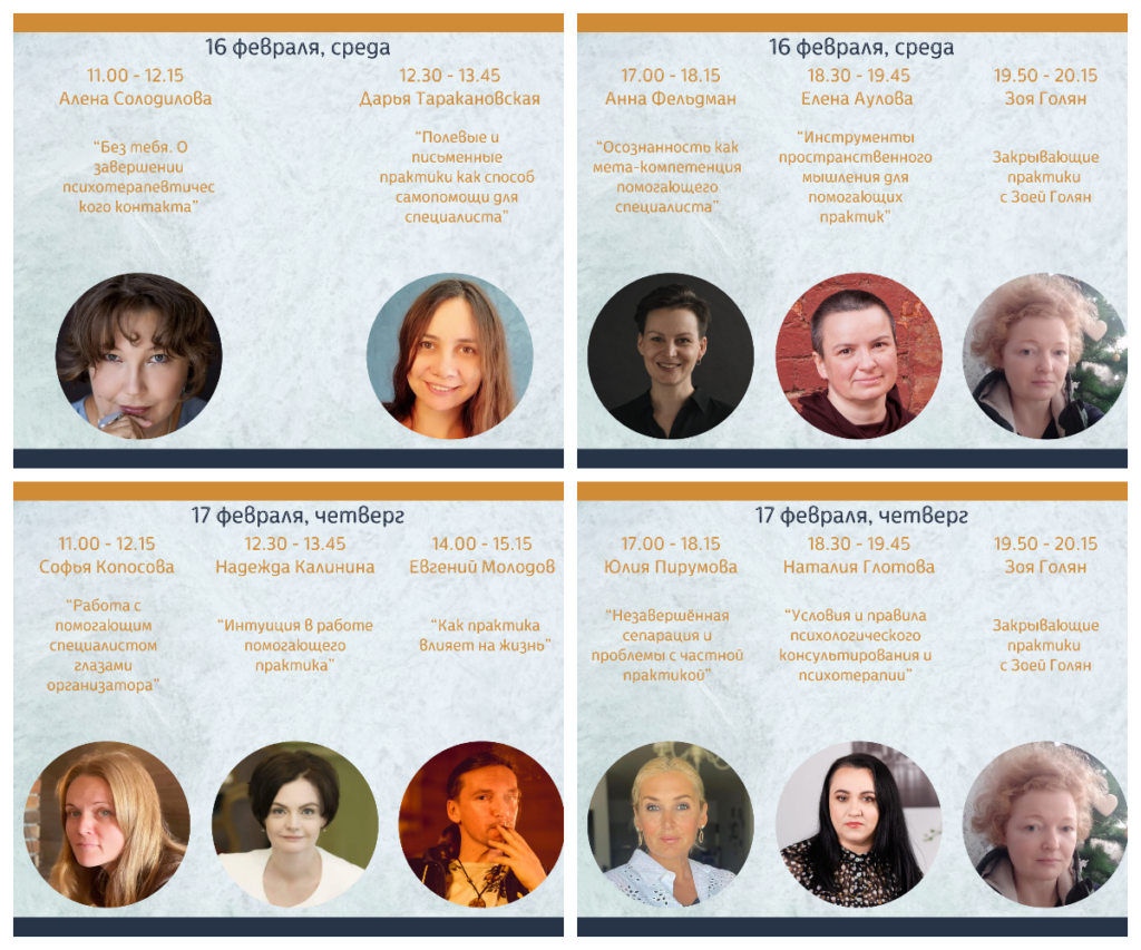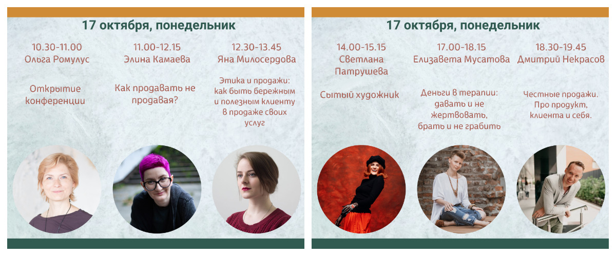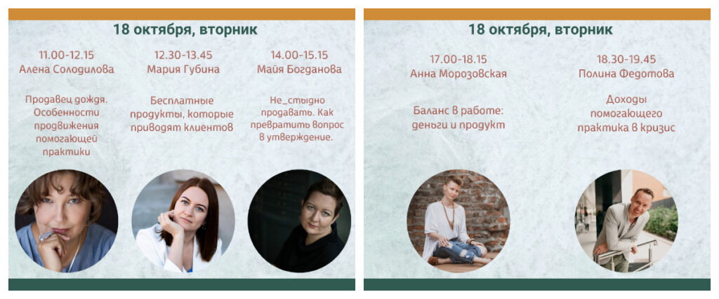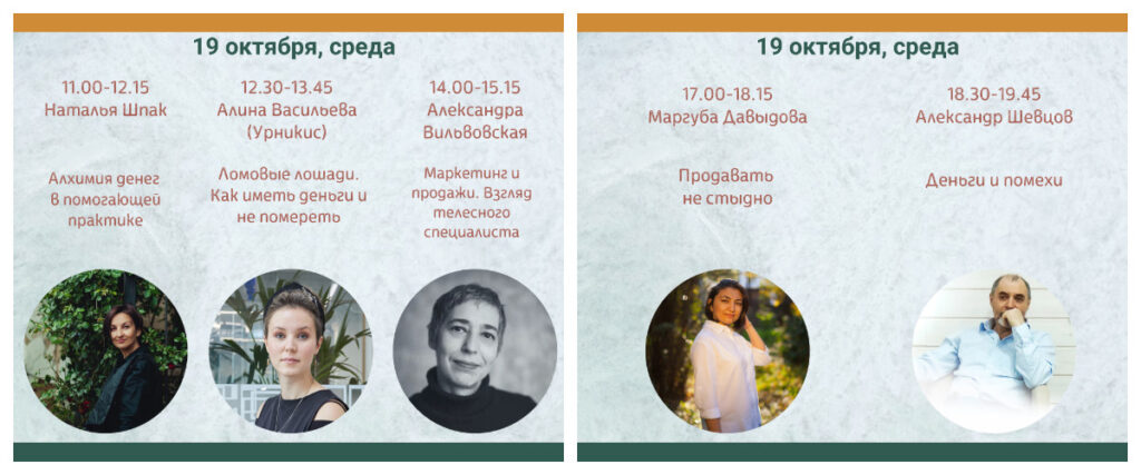 19 крутейших мастеров подготовили выступления, которые затронут самые важные темы — как стать профессионалом своего дела, как работать результативно и устойчиво, как развивать свою практику, как особенности нашей работы влияют на нашу жизнь в целом.