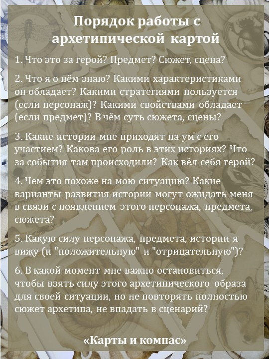 Кстати, с обычными метафорическими картами тоже можно работать в архетипическом ключе. Если мы найдём на карте персонажа, артефакт или архетипическую сцену и станем работать с ними, а не с композицией картинки.