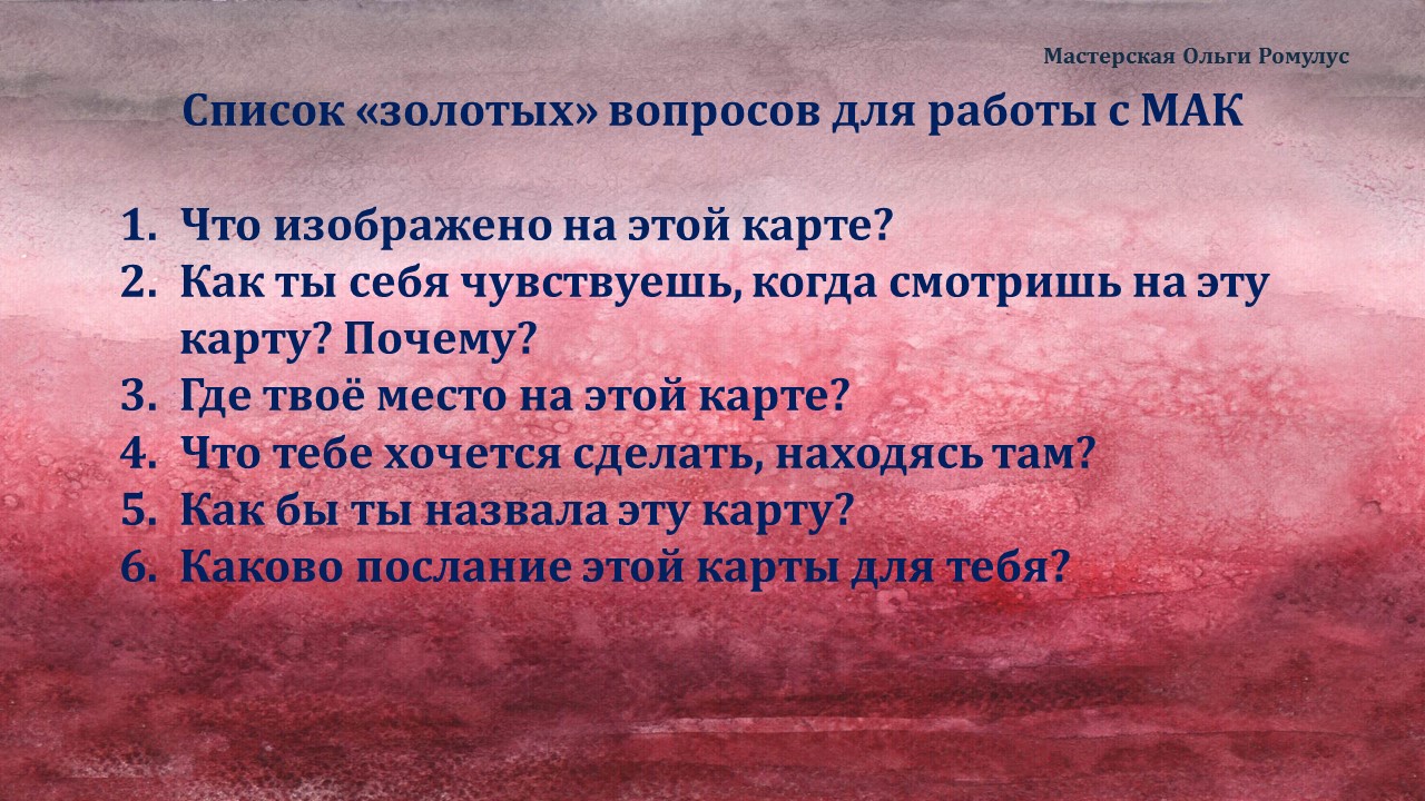 Вот помогающие вопросы: Что вы хотите узнать, что почувствовать, что сделать, какой стать с помощью карт в этом запросе?
