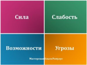 2. SWOT-анализ нынешнего состояния дел (можно применительно к цели, а можно просто «про меня сейчас») — четыре пункта на цветных фонах. «Сила. Слабость. Возможности. Угрозы».