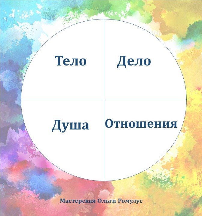 4. Вариация Колеса баланса, но всего с 4 сферами жизни — можно диагностировать (что происходит сейчас), а можно получать подсказки (что делать, чтобы стало лучше).