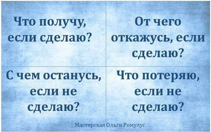1. Четыре квадрата с вопросами на голубом фоне — Квадрат Декарта (неклассический вариант, я модифицировала вопросы) — помогает проанализировать свою цель.