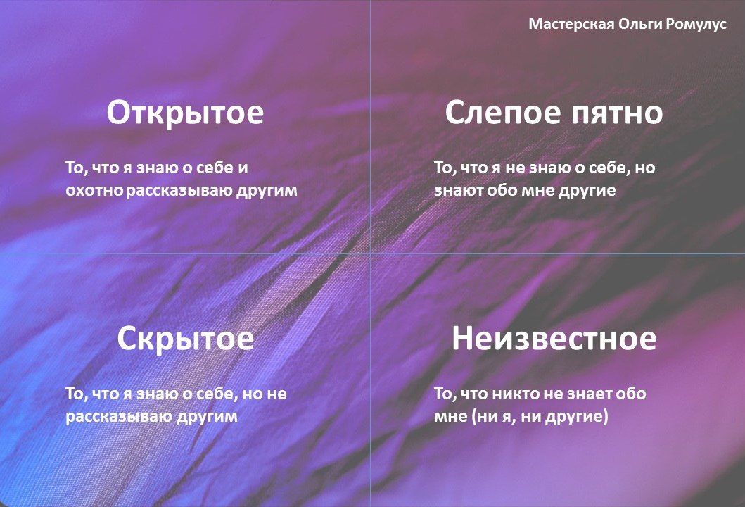 3. Окна Джохари с Открытым, Скрытым, Неизвестным окном и Слепым пятном — интересный вариант самоисследования — опять же можно с запросом, а можно просто «про меня сейчас»